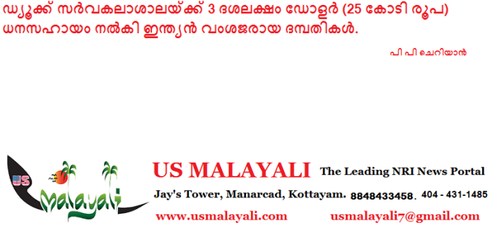 നോർത്ത് കരോലിന: ഇന്ത്യൻ വംശജനായ റേഡിയോളജിസ്റ്റ് വിജയ് രാമകൃഷ്ണനും ഭാര്യ പ്രവീണ രാമകൃഷ്ണനും ചേർന്ന് നോർത്ത് കരോലിനയിലെ പ്രശസ്തമായ ഡ്യൂക്ക് സർവകലാശാലയിലെ റേഡിയോളജി വിഭാഗത്തിന് 3 ദശലക്ഷം ഡോളർ (ഏകദേശം 25 കോടി രൂപ) ധനസഹായം നൽകി. സർവകലാശാലയിലെ മുൻ വിദ്യാർത്ഥി കൂടിയാണ് വിജയ്.